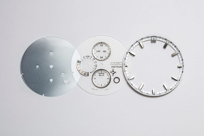 Az SSH159 számlap három rétege. A bal oldali, poliészter és akril kompozit anyagból készült reflektorlemez az alap, amelyre a számlaprész (középen) és a gyűrű alakú rész (jobbra) kerül elhelyezésre. A függőleges, csíkos struktúra mélyen benyomódik a számlap felületébe, amely áttetsző bevonatot kapott a hátlapon, így egy masszív, fémszerű textúrát kapunk.