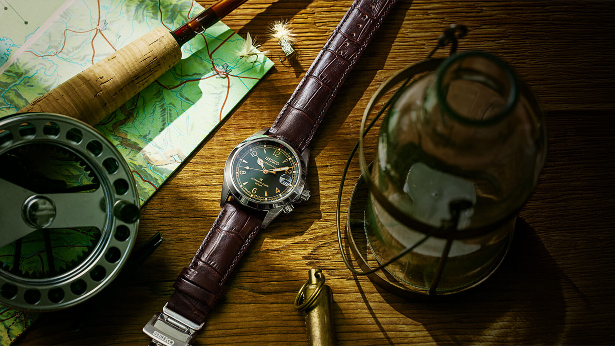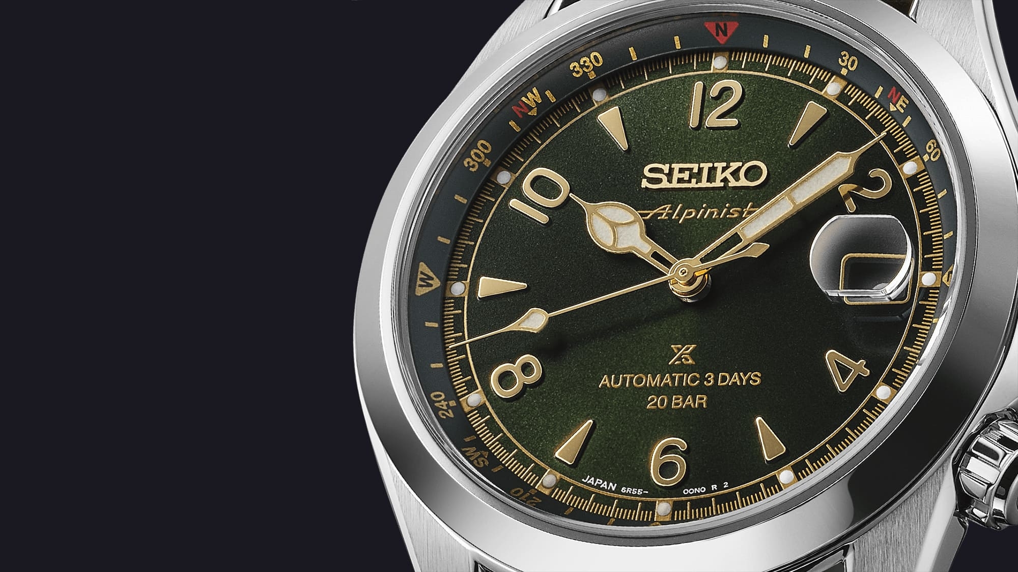 A fenyőzöld számlap az arany mutatókkal, indexekkel és feliratokkal, a nemesacél tok a jellegzetes formájával és a dupla koronákkal és a sötétbarna bőrszíj így együtt tökéletesen hozza azt az érzést, amit az Alpinist képviselni hivatott, és éppen ezért töretlen siker - immár a 6R55 kaliberrel kiegészítve.