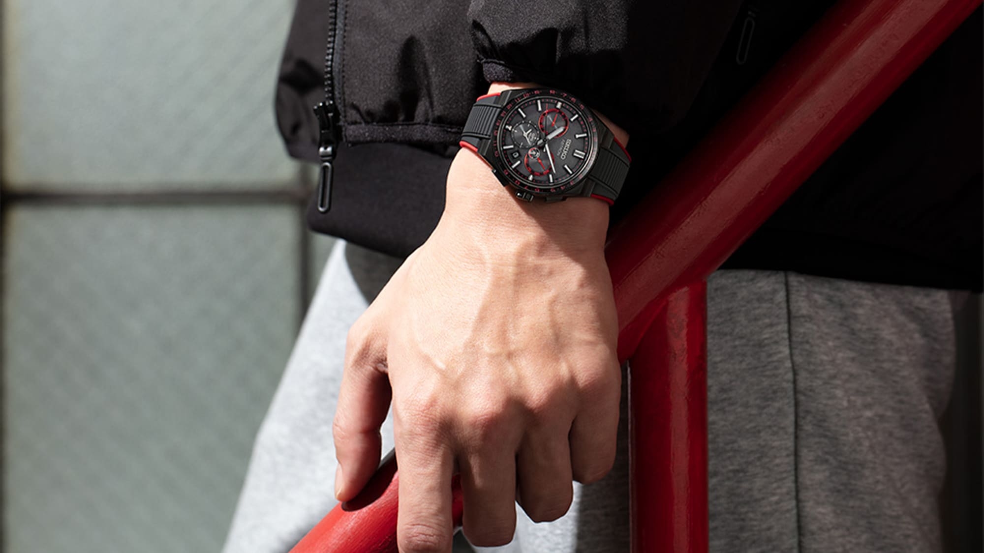 Az Astron SSH137J1 modell karakteres, határozott darab. A titán tok és fémszíj fekete bevonatot kapott, amely a vörös elemekkel erős designt alkot.