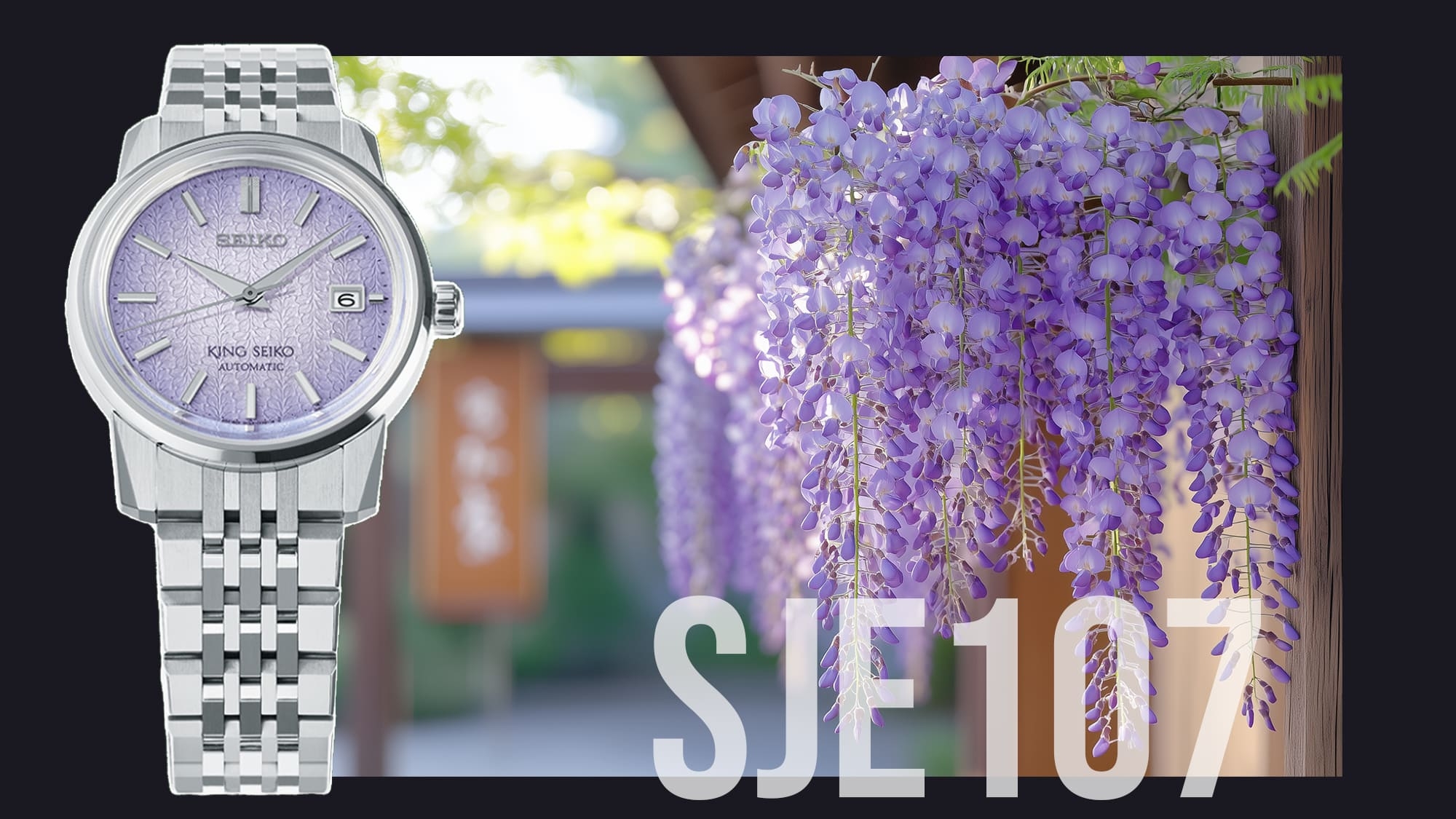 Az SJE107J1 modell a legkülönlegesebb a három újdonság közül, egyben a leginkább extravagáns megjelenésű. A Kameido szigetére annyira jellemző lilaakác különleges színét és a leomló virágfüzérek mintázatát is sikerült megörökíteni ezen a rendkívüli számlapon, az SJE107J1 egy igazán egyedi és különleges darab a fényviszonyoktól függően szinte szikrázóan világoslila színével.