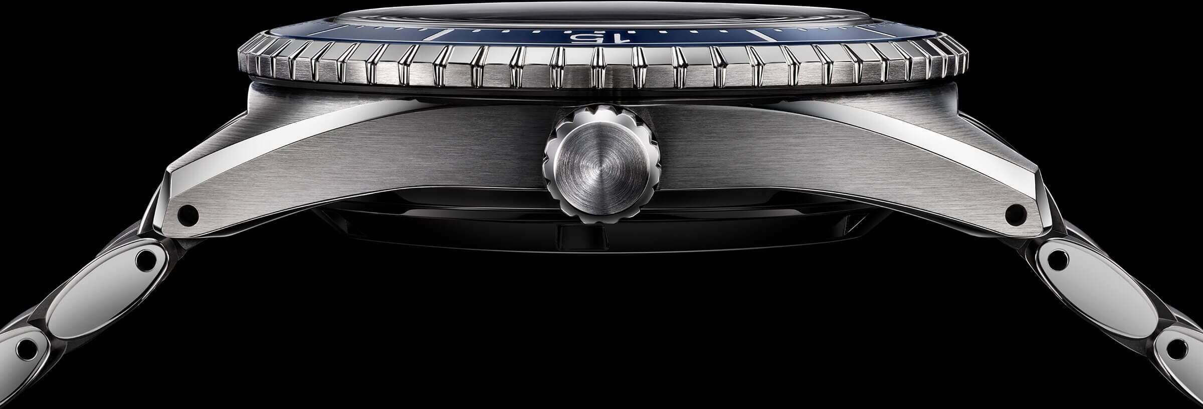 Fontos a megújult fémszíj (fémcsat) is, amely immár ötrészes kialakítású, és a középső szemek közül kettő polírozása eltér a többi szálcsiszolt felületétől, így az elegáns és prémium megjelenést erősíti ovális formájával is. A csat úgynevezett búvárhosszabbítós kivitel, amelynek segítségével egy mozdulattal meghosszabbítható és búvárruha ujjára csatolható.
