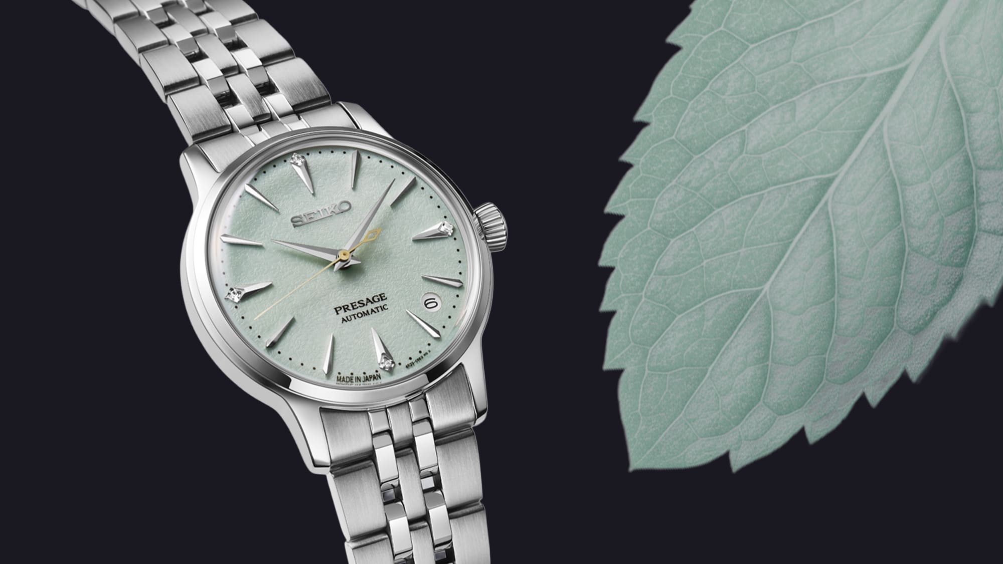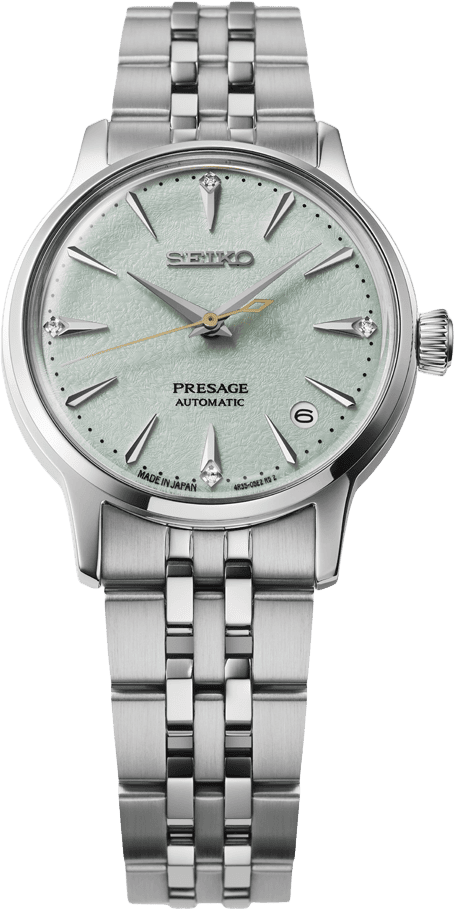 SRPL63J1, avagy a Frozen Mojito - egyike a legismertebb és legnépszerűbb koktéloknak. Kellemes zöldes árnyalatát a menta adja, a csillogó kövek és az arany másodpercmutató pedig visszafogott eleganciát adnak a megjelenésének.