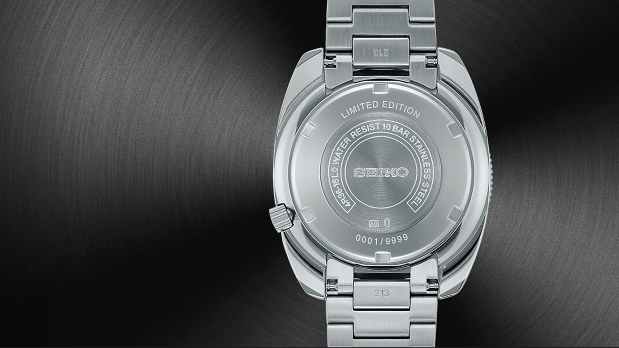 Szép megoldás a tömör nemesacél hátlap is, a hatvanas-hetvenes években ez a kategória még nem készült üvegbetétes hátlappal. A hátlapon a Seiko korabeli, jellegzetes patkó alakú keretben jelzi a legfontosabb adatokat, és feltüntetésre került a “Limited Edition” és az óra egyedi sorszáma is 1 és 9999 között, mivel mindkét modellből korlátozott darabszám készült.