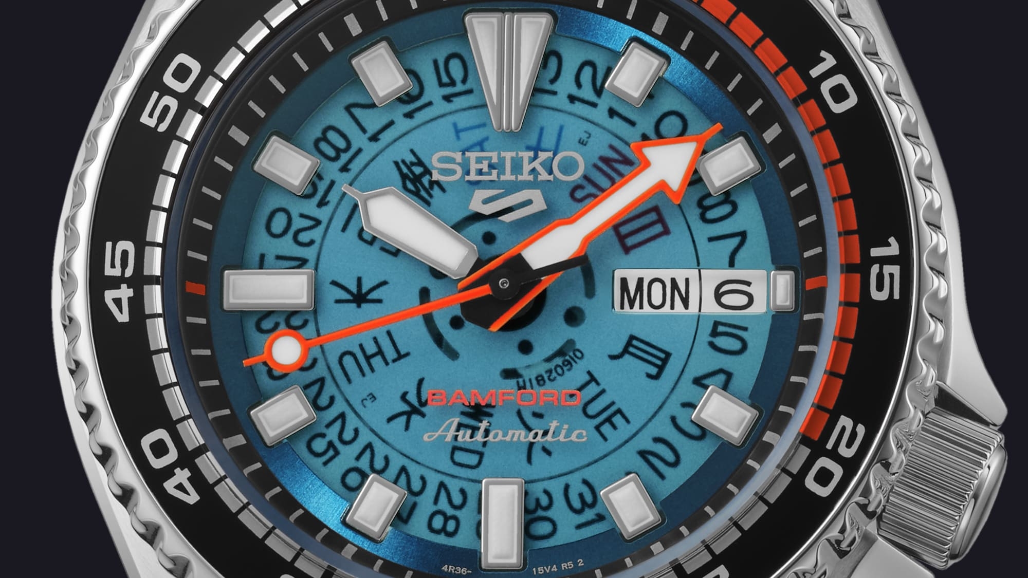 Szintén helyet kapott rajta a Seiko 5 logo 12 óránál, a klasszikus “Automatic” felirat hat óránál, és ugyanitt a “Retro Future” stílus jegyében neon narancssárga színben a Bamford logója is.