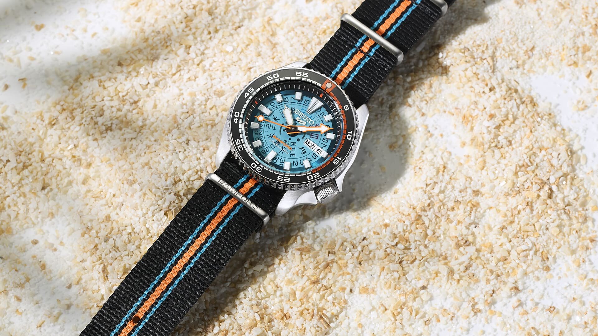 A foszforeszkáló bevonatok, színek és anyagok kiemelt jelentőségűek ennél a modellnél, hiszen sötétben és UV fény hatására az indexek és mutatók mellett a belső percosztás egyes elemei, a Bamford neve a számlapon, a búvárlünetta beosztása 20 percig is foszforeszkál, de a legkülönlegesebb mind közül a Nato stílusú szíj, amelynek a közepén végigfutó narancs sáv is szinte világít a sötétben - egy különleges kollab, különleges megoldásokkal.