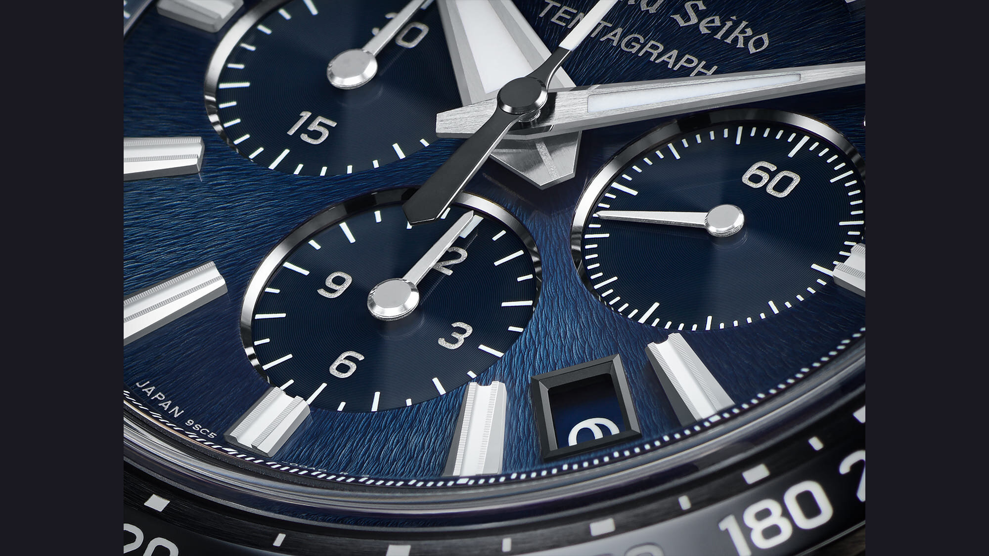 Az SLGC001G Tentagraph modell mélykék számlapja egy visszatérő Grand Seiko motívumot mutat be, a Shizukuishi stúdióból jól látható Iwate hegyének felszínét, hiszen tudjuk, a Grand Seiko számlapjai szinte mindig Japán sajátos természeti csodáiból inspirálódnak.