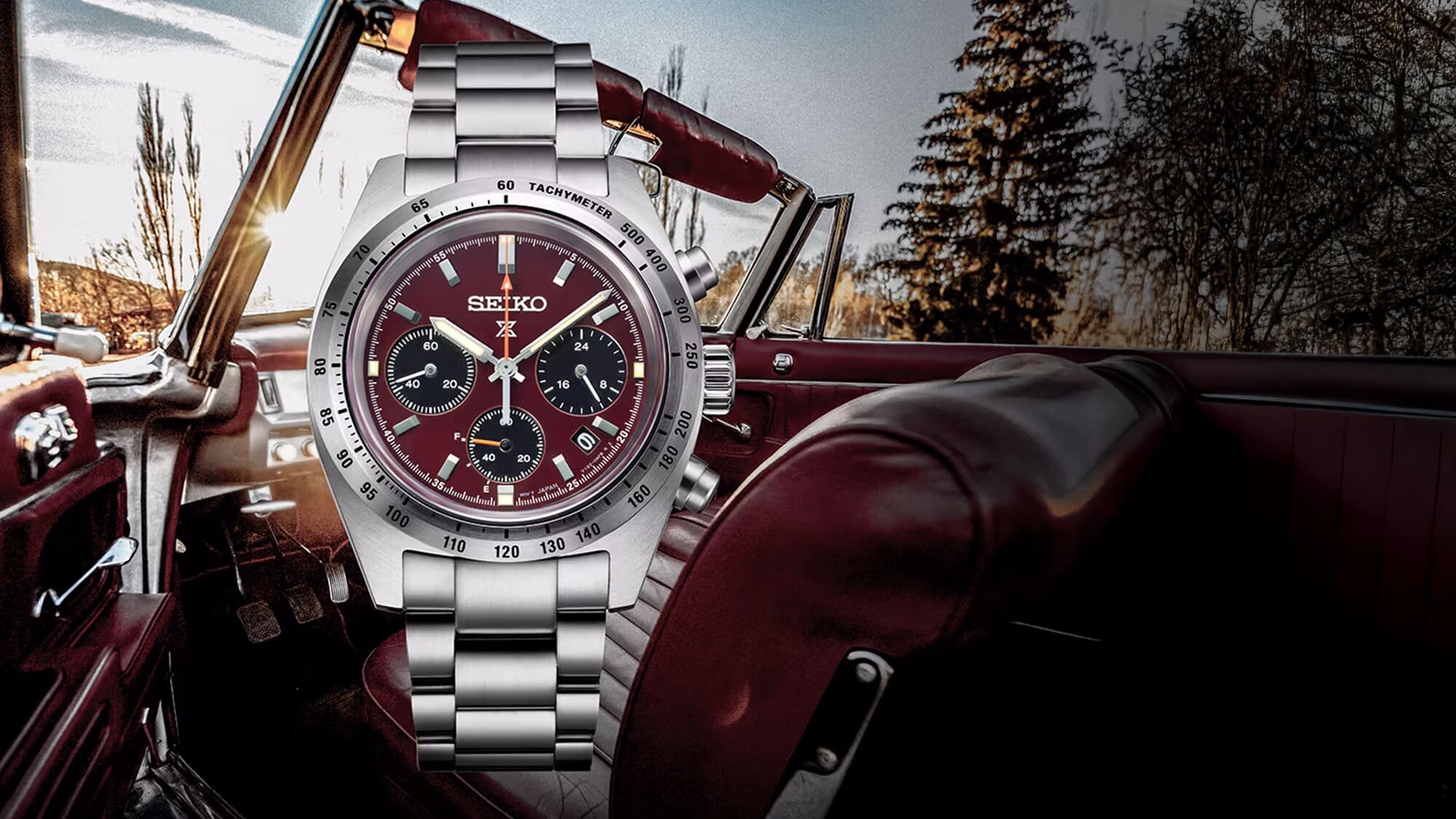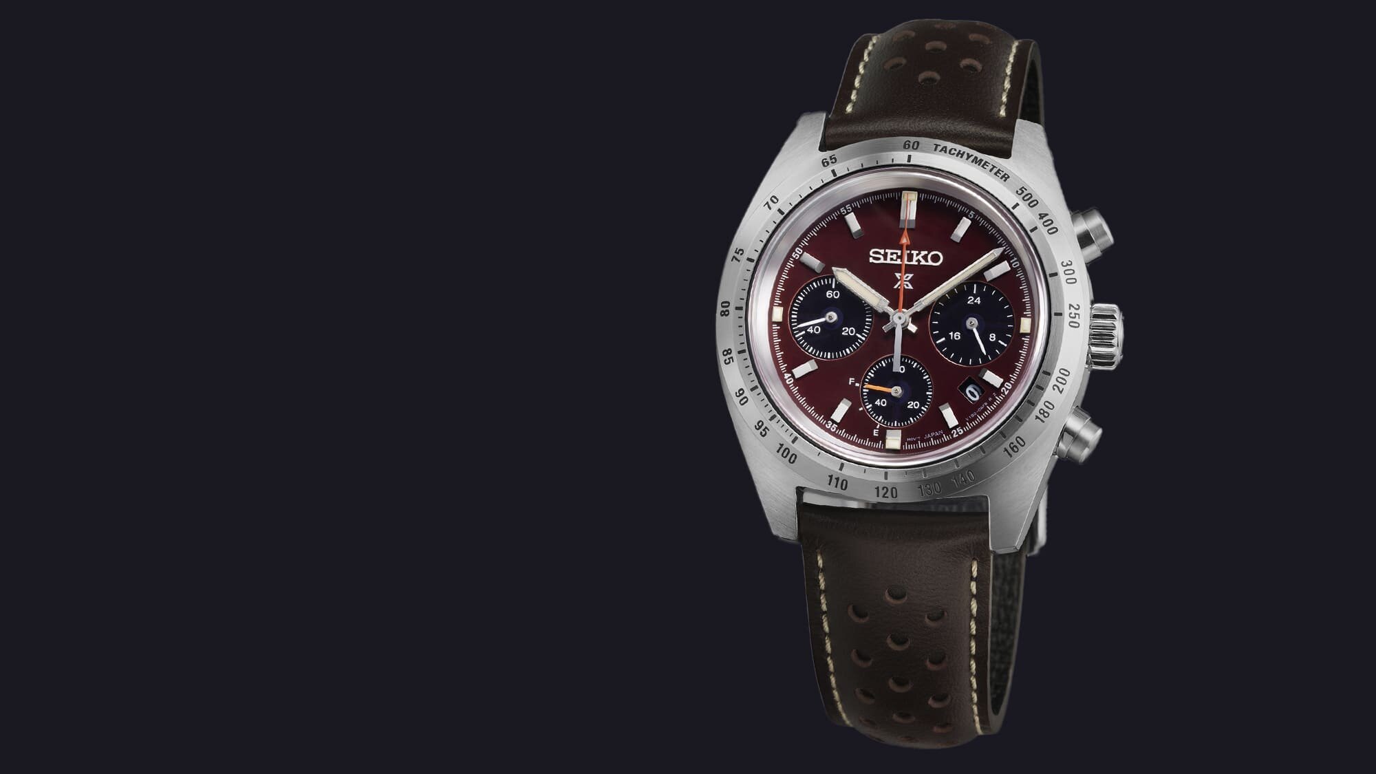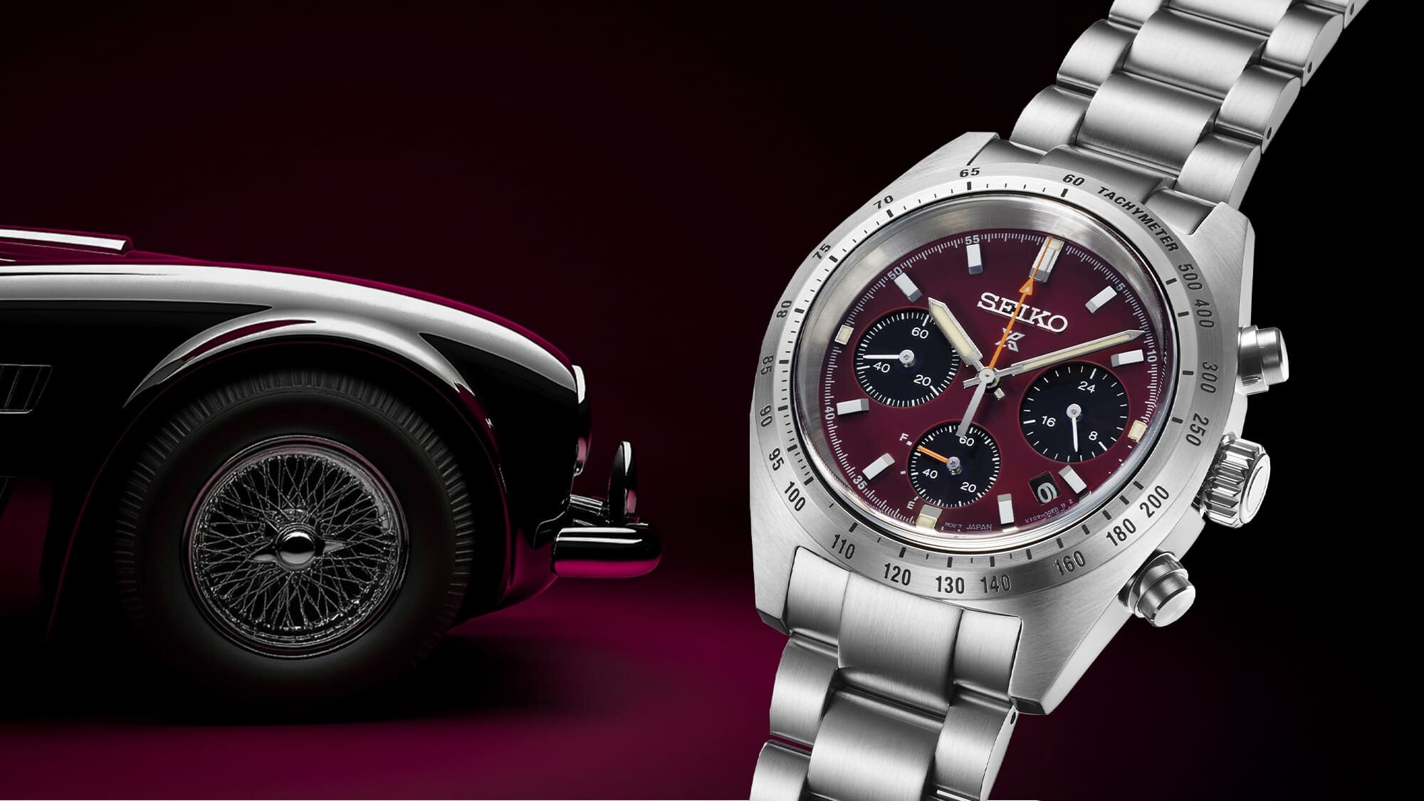 A különleges kiadás legegyedibb része természetesen a számlap, amely a burgundi vörös színével a hatvanas évek európai klasszikus sportautóinak világát idézi. A számlap színvilága harmonikus, a bézsben játszó Lumibrite festés az indexeken és a mutatókon szintén a vintage hangulatot erősíti, és mindezt megkoronázza a kronográf segédszámlapok közül a percgyűjtő és maga a másodpercmutató narancs színe - a sportos hangulat garantált.