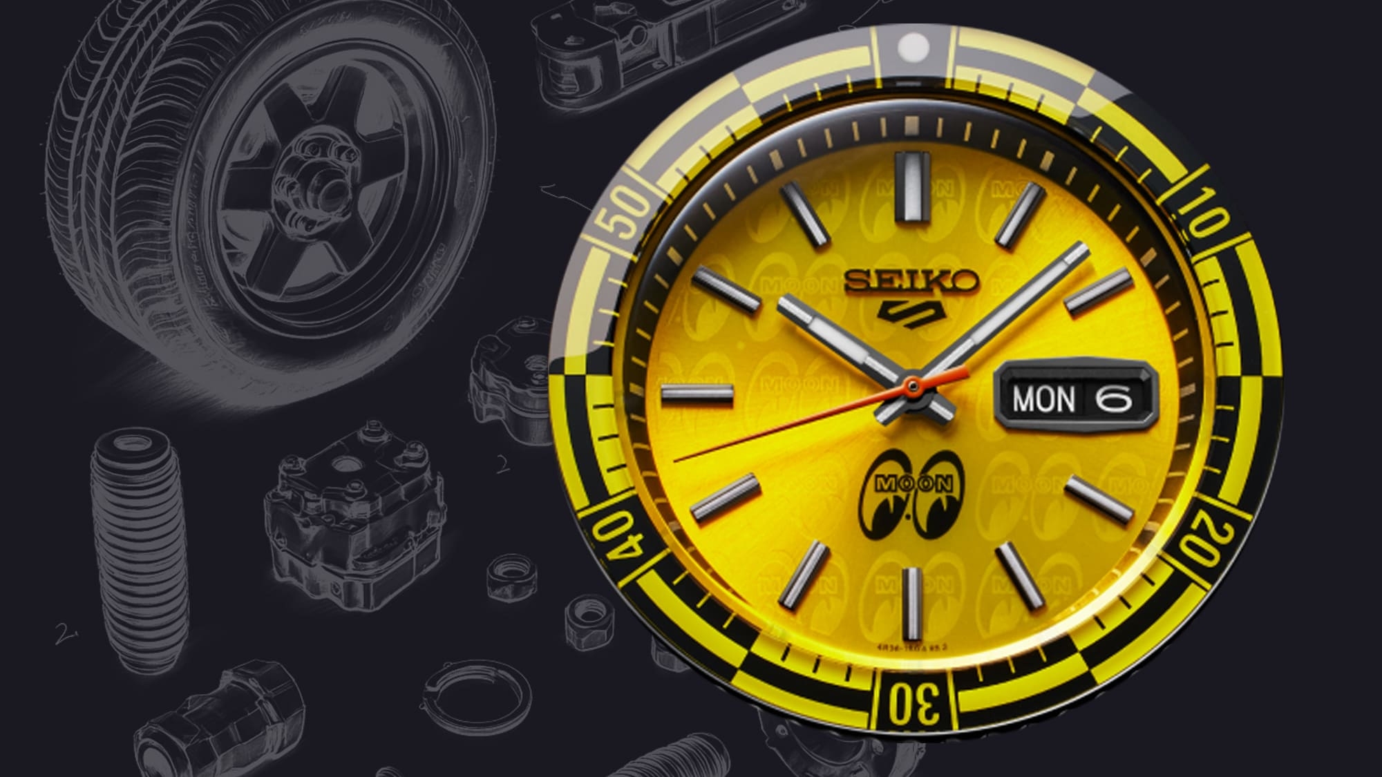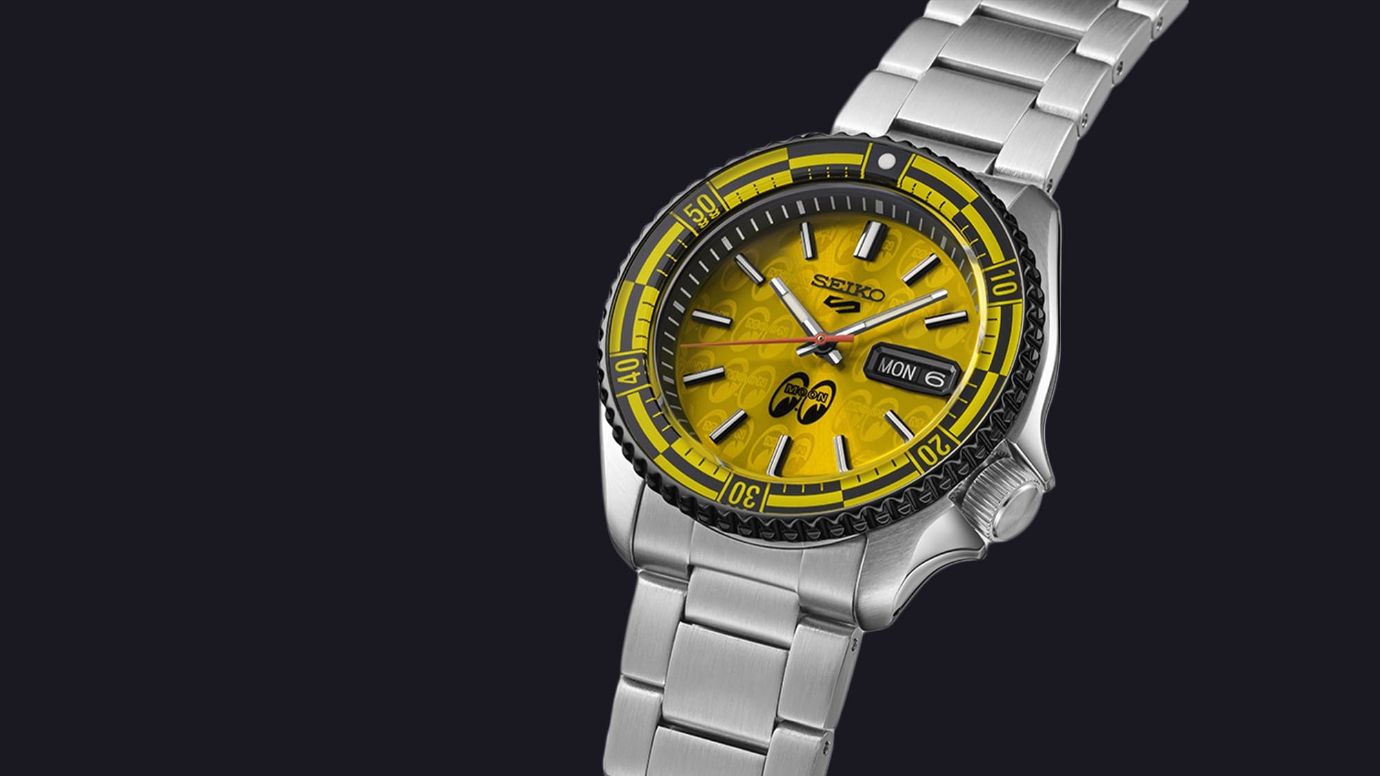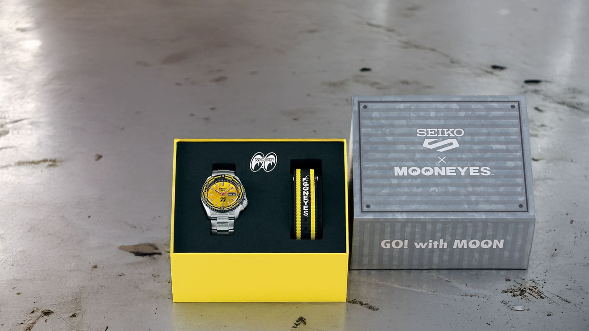 Az óra legjellegezetesebb eleme a színvilága, a fekete-sárga színösszeállítása a Mooneyes világát idézi, míg a design a Seiko 5 Sports korábbi sikeres modelljeinek kockás stílusában készült.