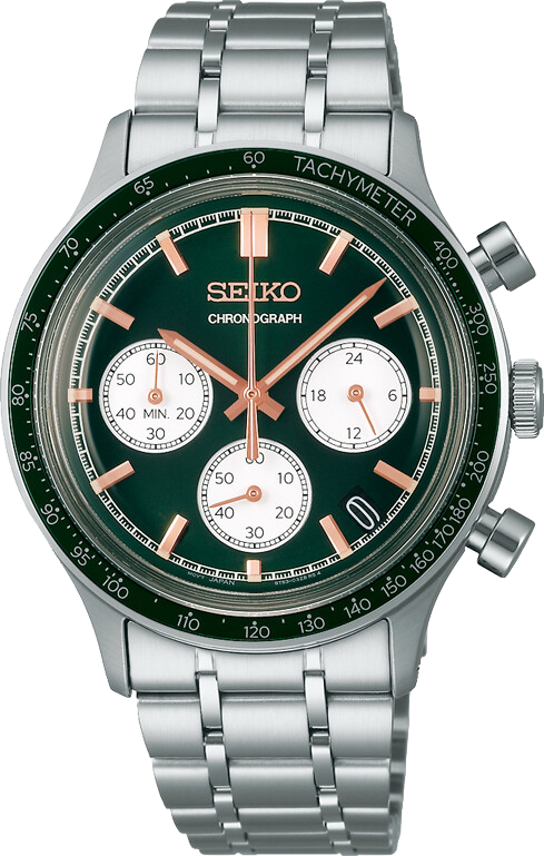 Az SSB481P1 modell a sportos elegancia felé hajlik inkább, a sötétzöld számlap a fehér segédszámlapokkal és a rózsaarany színű mutatókkal, indexekkel a kifinomultabb darabokat kedvelők kedvence lehet. A mutatók és az indexek természetesen Lumibrite festét kaptak, így sötétben is jól leolvashatóvá teszik az órát.