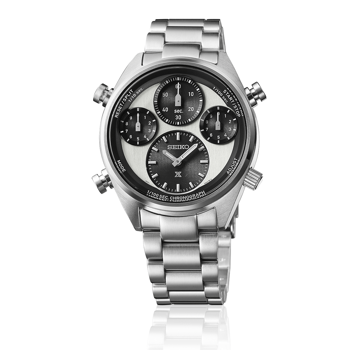Az új Prospex Speedtimer SFJ001P1 modellhez egy új kaliber jelenik meg 8A50 névvel. A nevében minden benne van, amit tudni kell és tudni érdemes róla - 1/100 solar chronograph. Az 1/100 jelentése a századmásodperc pontosságú időmérés, amely analóg, mutatóval történő kijelzés esetén igen magas érték, összehasonlításképp egy átlagos kronográf ⅕ másodperces pontossággal mér, az 1/100-as érték ennek a hússzorosa - finomabban, precízebben, kifinomultabban. A solar kronográf egy kvarc kaliber, amely energiaellátását a fény biztosítja, ezt alakítja át elektromos energiává és tárolja a működtetéséhez akár hat hónapon át. A működéséhez szüksége solar panelek a számlapok alatt helyezkednek el, a mai technológia már annyira hatékony, hogy minimális fény is elég a töltöttség fenntartásához. A design bármennyire is modern, korábbi sikeres Seiko modellekből merít, a négy külön számlapra osztott “multi dial” megjelenés egy kultikus Seiko modell, a Kinetic Chronograph stílusa mai formába öntve. A négy számlapon külön-külön elhelyezett mutatók közül alul, hat óránál találjuk a legnagyobbat, ez a hagyományos időmérésé. A másik három számlap a sportidőmérésé, 12 óránál számolja a másodperceket, 10 óránál a tizedek és 2 óránál a századmásodperceket - rendkívül látványos, ahogy ez a századmásodperces mutató szinte repül körbe, amíg a stopper funkciót használjuk. Az SFJ001P1 fekete-fehér (vagy ahogy az órák világában nevezik, a Panda) színben érkezik