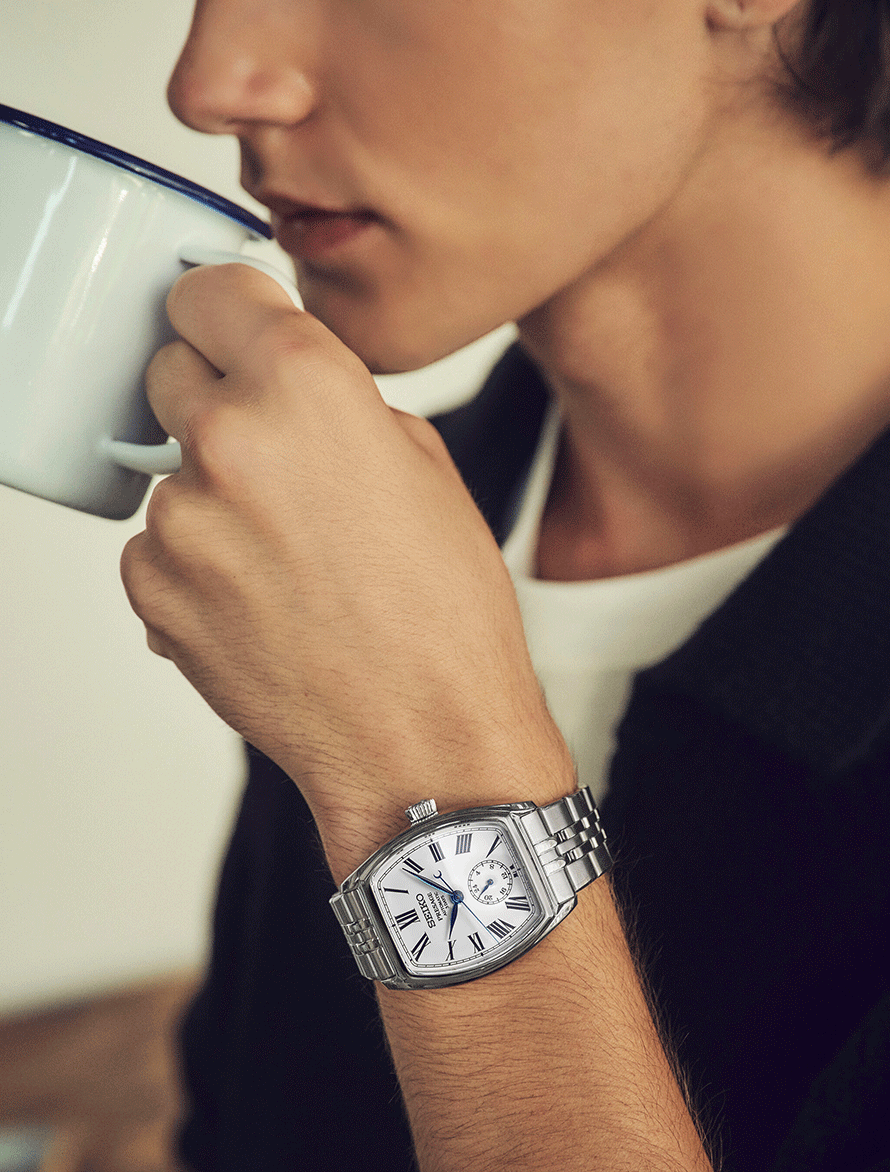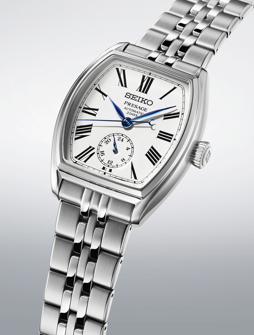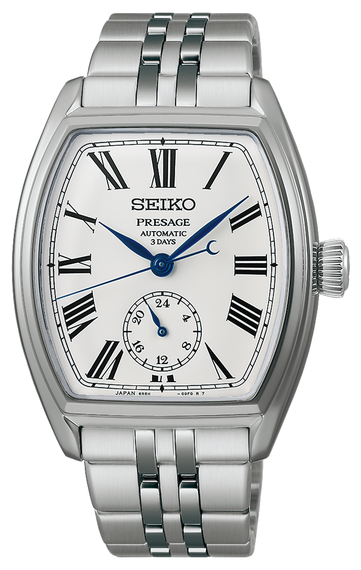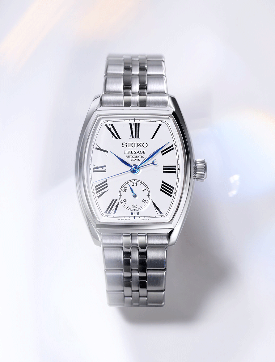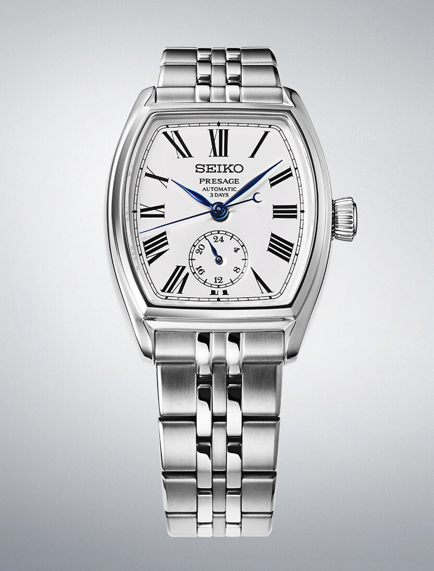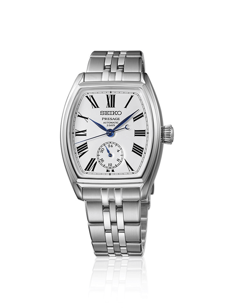A Presage Classic Series Craftsmanship Enamel „Tonneau” SPB537J1 a klasszikus órakészítés és a tradicionális japán kézművesség találkozása. A hordó alakú, úgynevezett tonneau tokforma ívelt vonalaival természetes módon simul a csuklóra, és az elegáns karórák ikonikus megjelenését idézi. A modell különlegessége a fehér zománc számlap, amely hagyományos, tüzes kemencében alkalmazott technikával készül, és időtálló, mély árnyalatával hosszú távon is megőrzi megjelenését. A római számokkal kialakított számlap, a 6 óránál elhelyezett 24 órás segédszámlap, valamint a kékített acél mutatók a Presage kollekció klasszikus stílusát képviselik. A nemesacél tok és fémszíj szuperkemény bevonatot kapott, tükröződésmentes zafírüveg tovább erősíti a prémium összhatást. A modell a Seiko 6R5H automata mechanikus kaliberével készül, 3 napos járástartalékkal, 5 bar vízállósággal.