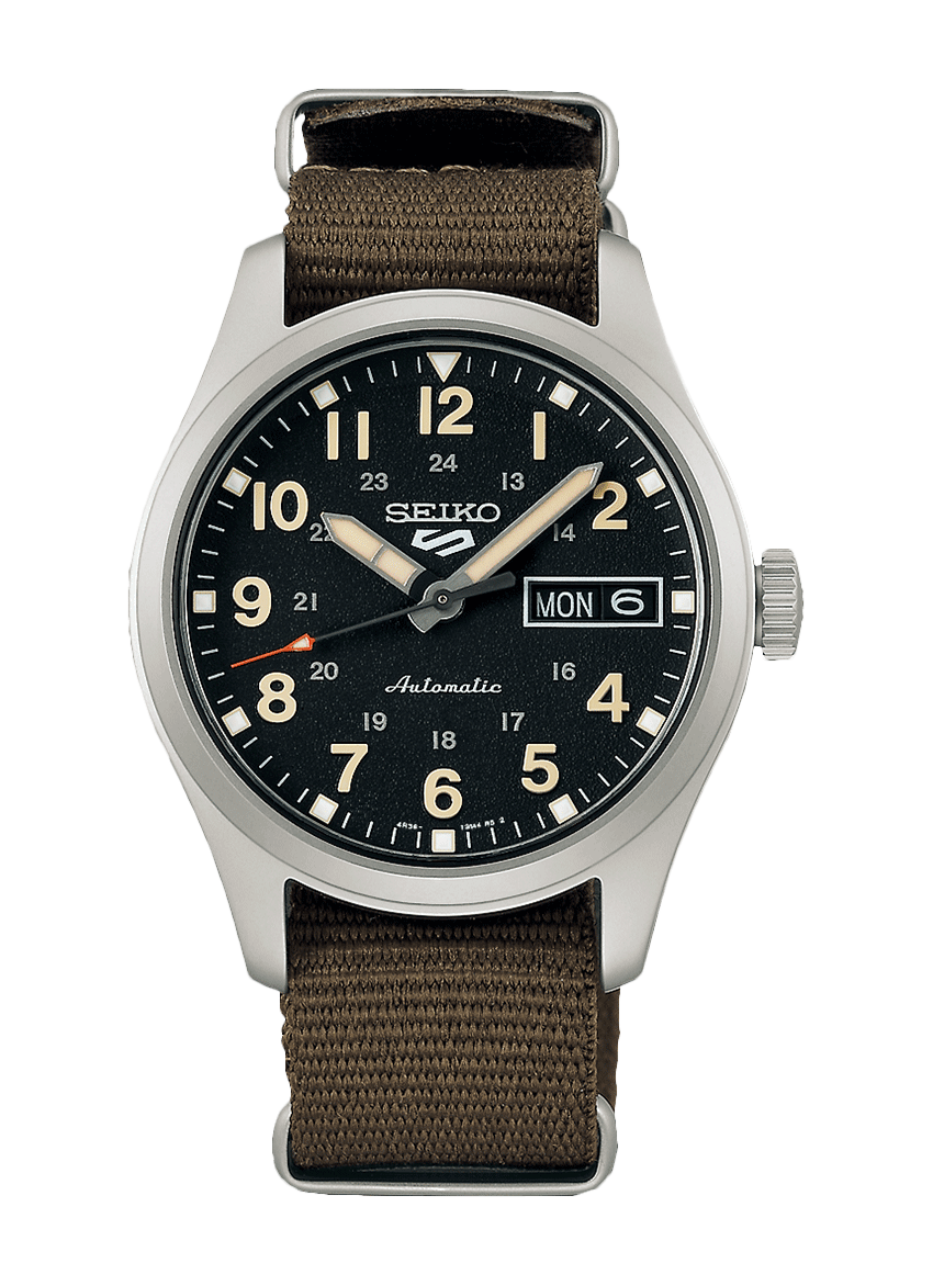 A Seiko 5 Sports “field” modellek az órák világában egy külön kategóriát képviselnek, a katonai stílus egy kicsit polgárivá szelídített változatai, igen jellegzetes, könnyen felismerhető stílusjegyekkel. A katonai jellegre több jel is utal, az egyik legszembetűnőbb a 12-es index helyén lévő háromszög alakú jelzés, amely a katonai repülés egy szimbóluma, a műszereken a pozíció gyors azonosítását teszi lehetővé. Az arab számos indexek is a gyors és biztos leolvasást segítik, a 12 órás skála mellett pedig helyet kap egy 24 órás, második skála is, amely az angolszász világban szintén csak a katonai területeken használt, a mindennapokban csak a 12 órás skálára van szükség. A 36.4 mm-es átmérőhöz 12.5 mm-es vastagság társul, így a tok arányos és kényelmesen viselhető mind az átmérője, mind a vastagsága, mind az ezekből eredő, a korábbinál kisebb súlya miatt is .Az SRPJ85K1 modell egy kissé vintage hangulatú pilóta órát idéz fel. A fekete számlapon a halvány bézs színű mutatók és számjegyek egy megfakult, sokat látott órát juttatnak a szemlélője eszébe, a barna textil szíj pedig csak erősíti ezt az érzést – vintage hangulat és mai technika, a tökéletes párosítás. A modellt 4R36 kaliberrel alkották meg, amely 24 köves, kézi felhúzóval, 41 órás járástartalékkal rendelkezik. Ez a karóra automata szerkezettel szerelt, amely a kéz mozgásából származó mozgási energiát alakítják át a működéshez szükséges energiává úgy, hogy a szerkezetben található súly körkörös mozgása során a rugó felhúzásra kerül.