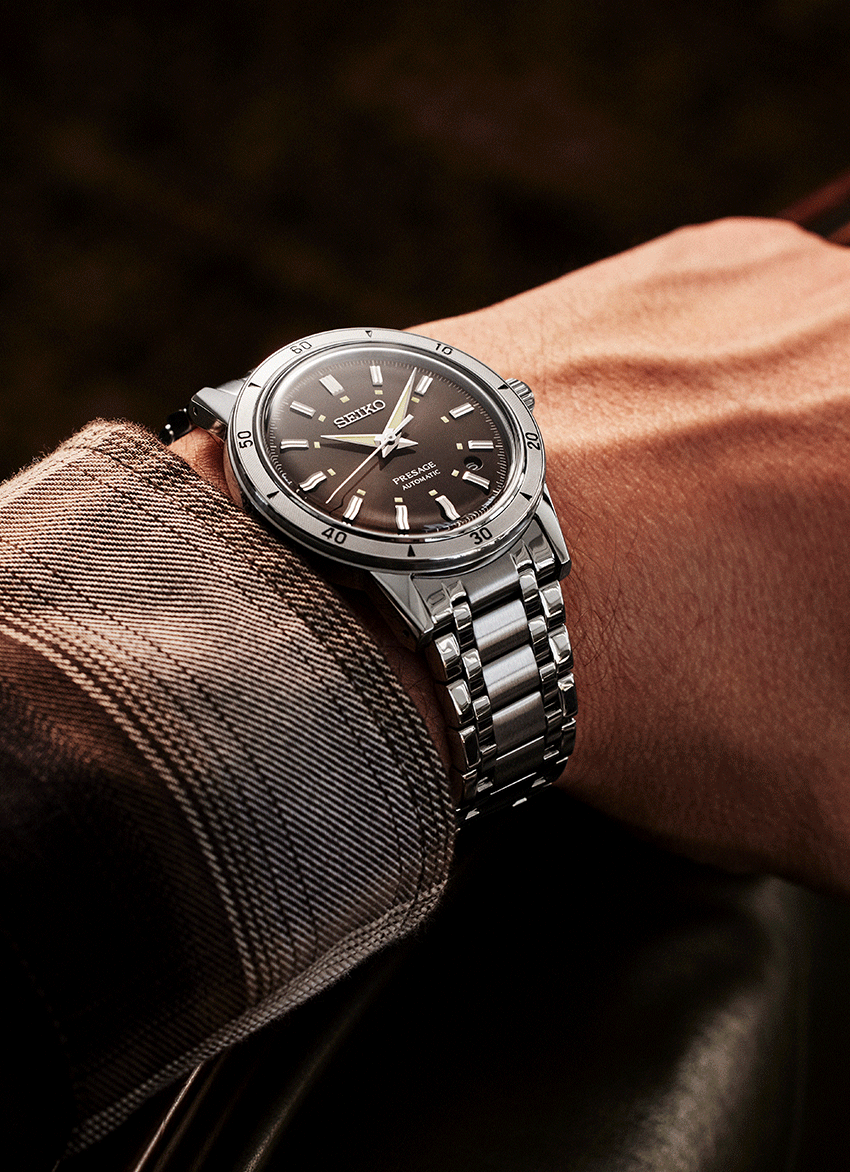A Presage Style 60’s sorozata azokat a hatvanas éveket idézi fel, amelyekre sokan oly szívesen gondolunk, ha az óraipar és a Seiko történelméről esik szó. Az SRPL09J1 modell, mély barna számlapjával jól hozza a sorozatban megismert hangulatot. Úgy lett modernebb, hogy közben mit sem változott a megjelenése, csak a részletek finomodtak, és néhány adat változott. Kisebb lett a tok, a korábbi modellek 40.8 mm-es mérete helyett immár 39.5 mm az átmérője, ez jól illeszkedik az óraiparban évek óta látható óvatos “downsizing” sorba, a korábbi folyamatos méret növekedés helyett most újra fordult a trend, ezúttal a csökkenést látjuk. A számlapon felfedezhetünk egy érdekességet, az eddigi, 3 óránál elhelyezett és fém kerettel ellátott dátumablak helyett a komplikáció 4 és 5 óra közé költözött, a szerkezet azonban változatlanul a jól ismert 4R35 mechanikus automata kaliber.